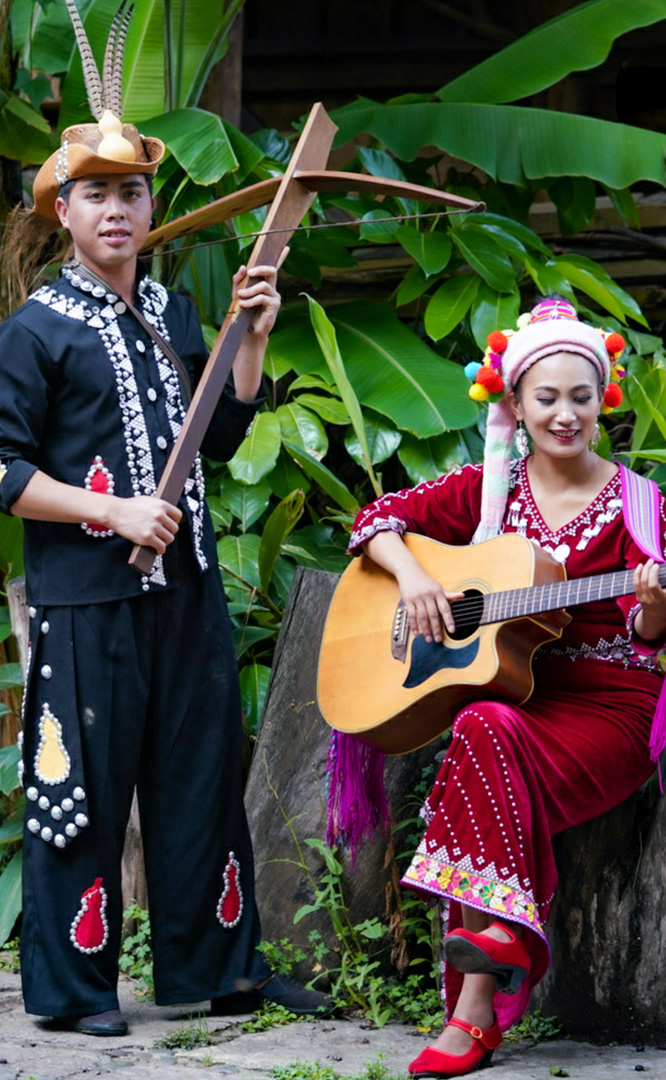 德昂族人口約1.7萬(wàn),主要分布在德宏州和保山市的潞西、梁河、瑞麗、隴川、隆陽(yáng)等縣區(qū)。民居多為草排覆頂竹木結(jié)構(gòu)的干欄式建筑,眼前的德昂村建筑納入了能容納數(shù)十人居住的德昂大房子,氈帽頂?shù)男》孔樱€有頗具浪漫色彩的大公房、小公房……還建有“龍陽(yáng)塔”標(biāo)志及佛教奘房、佛塔。德昂族民間普遍信奉南傳佛教,民俗活動(dòng)與佛事活動(dòng)關(guān)聯(lián)緊密。潑水節(jié)、開門節(jié)、關(guān)門節(jié)是重大節(jié)日。德昂族服飾色彩豐富,口頭文學(xué)特別是民歌創(chuàng)作活動(dòng)...